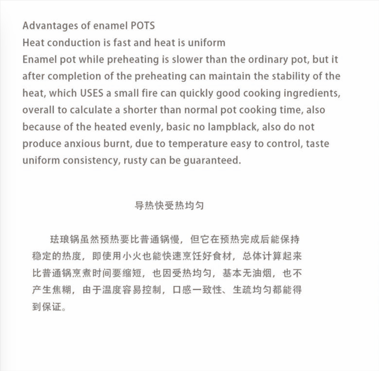珐琅锅虽然预热要比普通锅慢,但它在预热完成后能保持稳定的热度,即使用小火也能快速烹饪好食材,总体计算起来比普通锅烹煮时间要缩短,也因受热均匀,基本无油烟,也不产生焦糊,由于温度容易控制,口感一致性、生疏均匀都能得到保证。